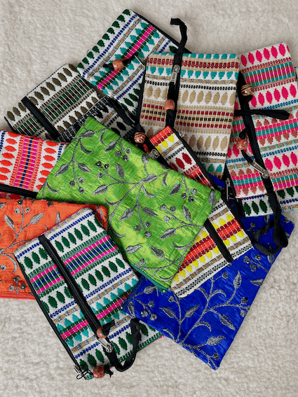 Derzeit sind drei Taschen in Wildseide (orange, blau, grün) mit Trennung innen und zehn gewebte Taschen (Farben sortiert) mit Reißverschlussfach aussen auf Lager